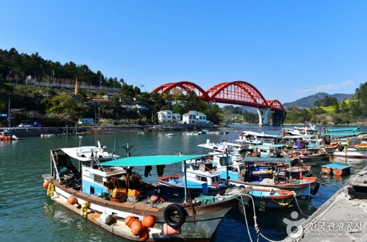 2003년 개통된 창선·삼천포대교로 갈 수 있습니다. 창선·삼천포대교는 '한국의 아름다운 길 100선'에 선정될 만큼 멋진 풍경을 자랑합니다. 해안선을 따라 낚시포인트가 골고루 분포되어 있으며 특산물로 피조개, 새조개, 개조개, 바지락, 미역, 홍합, 개불 등이 있습니다.