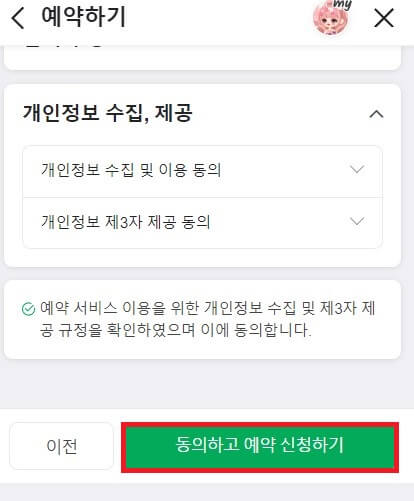 6. 개인정보 수집, 제공 <동의하고 예약 신청하기> 를 클릭합니다.